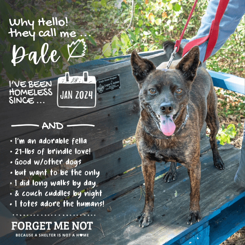 - This is what I dream about when I dream about my perfect person or family: an active household where my humans and I take nice long walks, play, and then couchtime together! You won't find a better exercise buddy or Netflix binge partner...furreal! I'm a 21-pound bundle of brindle love who digs learning new things. So I hope my new human - or humans - will continue training with me. One more thing: I'm devilishly handsome. Come see for yourself!