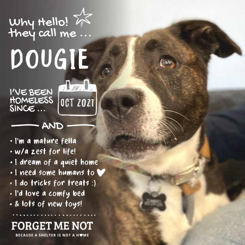 - This is what I dream about when I dream about my perfect person or family: a quiet, low-traffic household where I can feel loved and secure. I'm a joyous pup who would thrive in a stable home with kind, trusted humans who appreciate my sweet, spirited nature. My future family will give me a routine, comfy bed, and lots of toys and affection...muah! Mostly I want a stable, secure home life with people to enjoy my abundant love and who will love me back. So c'mon, let's be dance partners together in this thing called life! Time to boogie with Dougie!